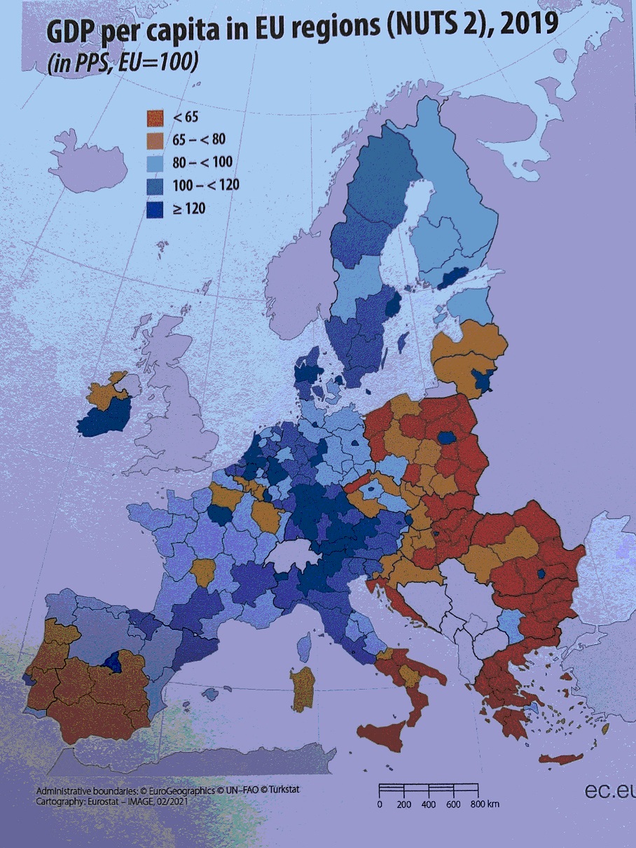 El pasado 5 de marzo Eurostat, la oficina de estadística de la Unión Europea, publicaba el PIB per cápita, en Paridad de Poder de Compra (PPA) del año 2019, de la UE-27 al excluir el Reino Unido. El informe confirma el enorme diferencial existente, entre la de mayor PIB per capita en PPA Luxemburgo que se sitúa en el 260,00% de la media, y las de menor como Mayotte (Francia) y Severozapaden (Bulgaria) que se sitúan en el 32,00% de la media de la Unión Europea.
