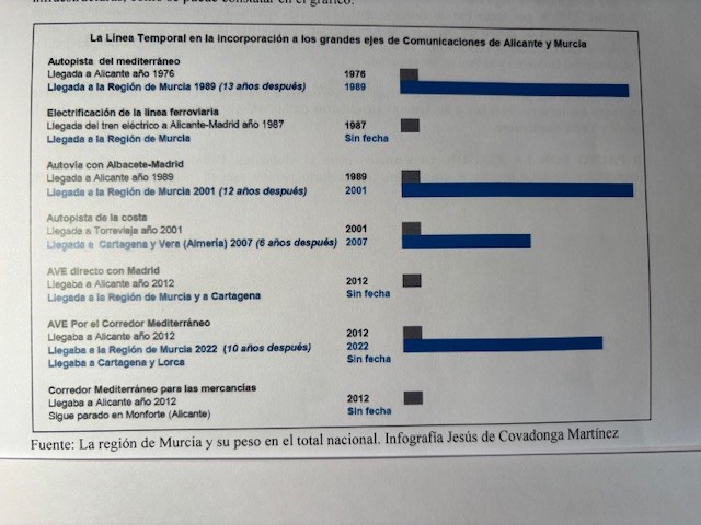 La Región de Murcia ha sido la gran olvidada en su incorporación a los grandes ejes de comunicaciones, tanto viarias, como ferroviarias, aeroportuarias y portuarias, como se puede constatar en el gráfico de la realidad temporal en la disponibilidad de las infraestructuras