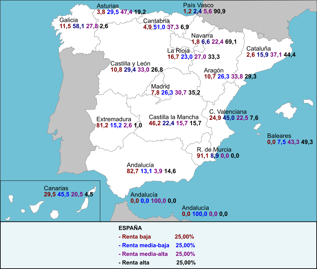 En el estreno contrario, destacaron la Región de Murcia (el 91,10% de sus municipios se situaba entre el 25,00% con menor renta (menos de 12.505 euros) y Andalucía (con el 82,70%).