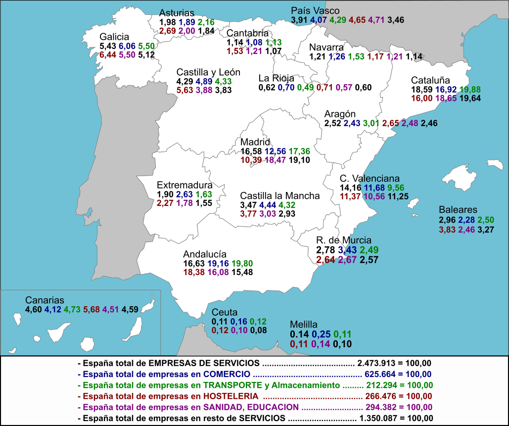El mapa recoge en negrita el porcentaje de Empresas de cada Comunidad y Ciudad autónomas sobre el total nacional de las Empresas de Servicios, en azul el correspondiente a las empresas del Comercio, en verde el correspondiente a Transportes y Almacenamiento, en rojo el correspondiente a la Hostelería, en granate a las Empresas de Sanidad y Educación y en negrita al resto de las Actividades del sector de los Servicios, lo que nos permite una panorámica de las distintas realidades en las Comunidades autónomas en relación a la media nacional.