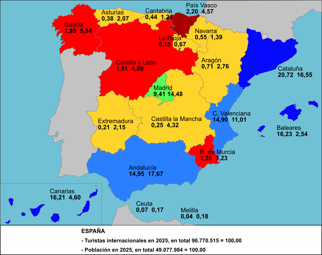 Mapa en el que se recogen los porcentajes por Comunidades y Ciudades autónomas de los turistas internacionales que han recibido en 2025 sobre el total nacional, así como el porcentaje de su población.