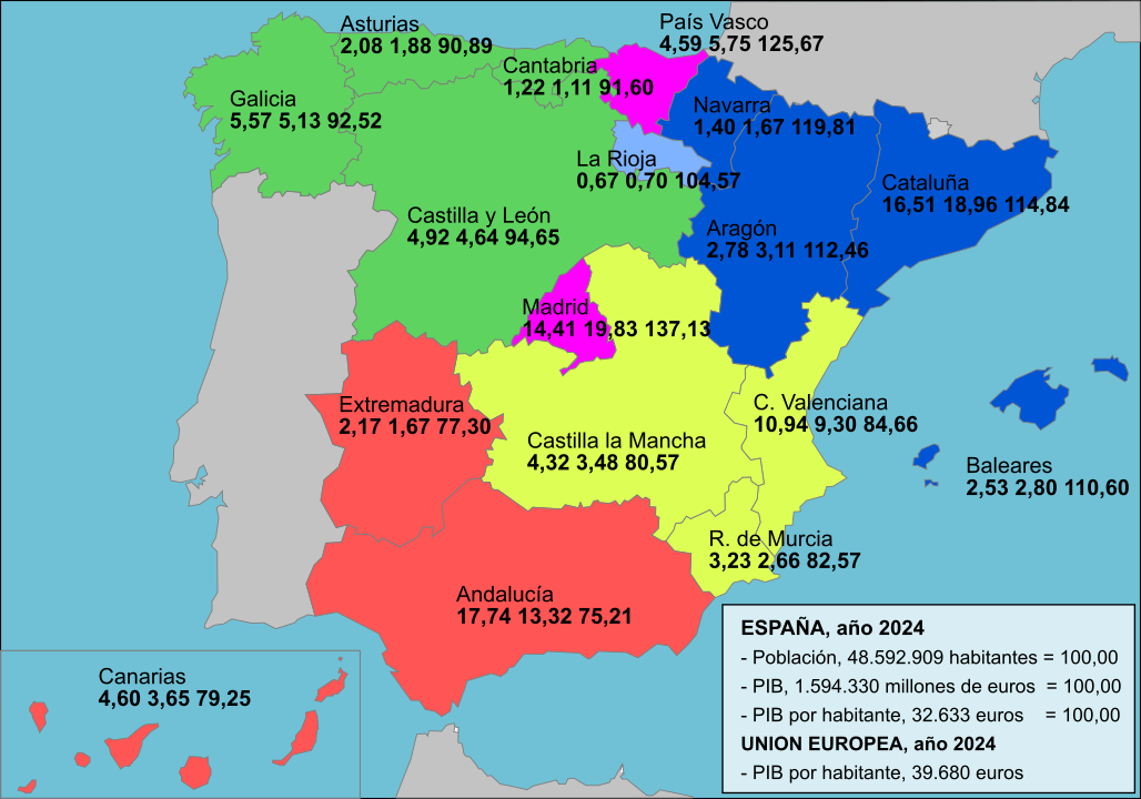 Así podemos constatar las Comunidades cuya aportación porcentual al PIB nacional supera su aportación poblacional, que son: Aragón con el 2,78% de población aporta al total del PIB nacional el 3,11%. Baleares con el 2,53% de población aporta el 2,80%. Cataluña con el 16,51% aporta el 18,96%. Madrid con el 14,41% aporta el 19,83%. Navarra con el 1,40% aporta el 1,67%. País Vasco con el 4,59% aporta el 5,75% y La Rioja con el 0,67% de la población aporta el 0,70% al total del PIB nacional, así como el porcentaje sobre la media nacional en el PIB por habitante.