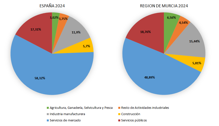 Los gráficos recogen el porcentaje que cada uno de los sectores productivos aporta al total del VAB, tanto a nivel regional como nacional, lo que nos permite comparar la realidad productiva de la Región de Murcia con la media nacional en el año 2024.