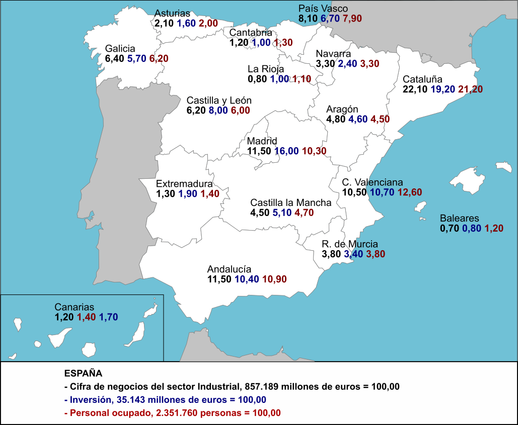 La mayor cifra de negocios en el sector industrial corresponde a Cataluña con el 22,10% del total nacional, le siguen Madrid 11,50%, Andalucía 11,50%, la Comunidad Valenciana 10,50% y el País Vasco con el 8,10%, Galicia 6,40%, Castilla y León 6,20%, Aragón 4,80%, la Región de Murcia 3,80%, Navarra 3,30%, Asturias 2,10%, Extremadura 1,30%, Cantabria y Canarias 1,20%, La Rioja 0,80% y Baleares el 0,70%.