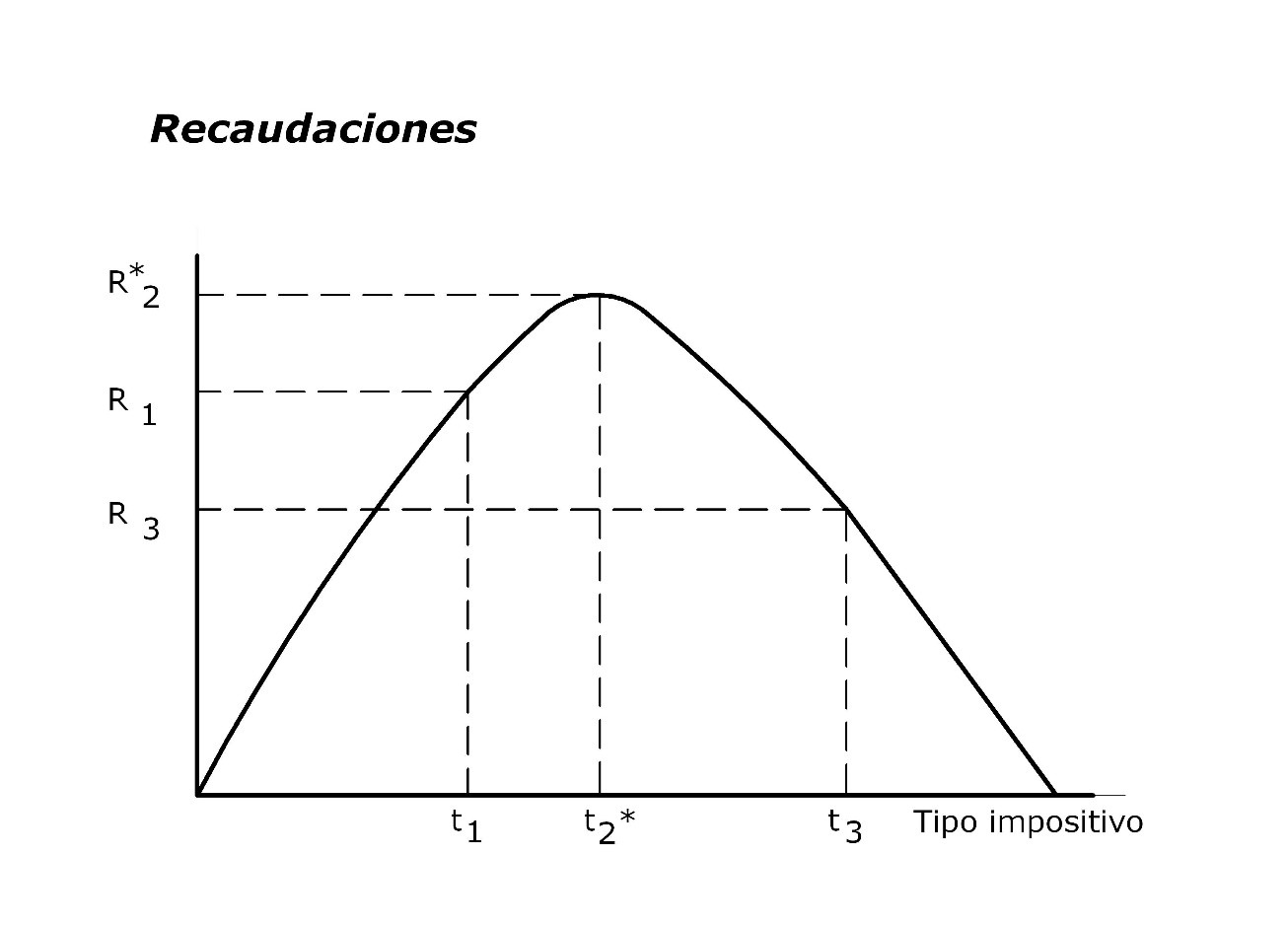 Dice el economista Laffer que si medimos el aumento del impuesto, a través de un tipo impositivo medio t, tendríamos la siguiente curva: Cuando el tipo impositivo es t1, la recaudación, al aplicar el tipo sobre la renta, será una cantidad positiva mayor de cero (concretamente R1). Si aumentamos el tipo, la recaudación seguirá creciendo hasta alcanzar el máximo en R2, para un tipo t2.