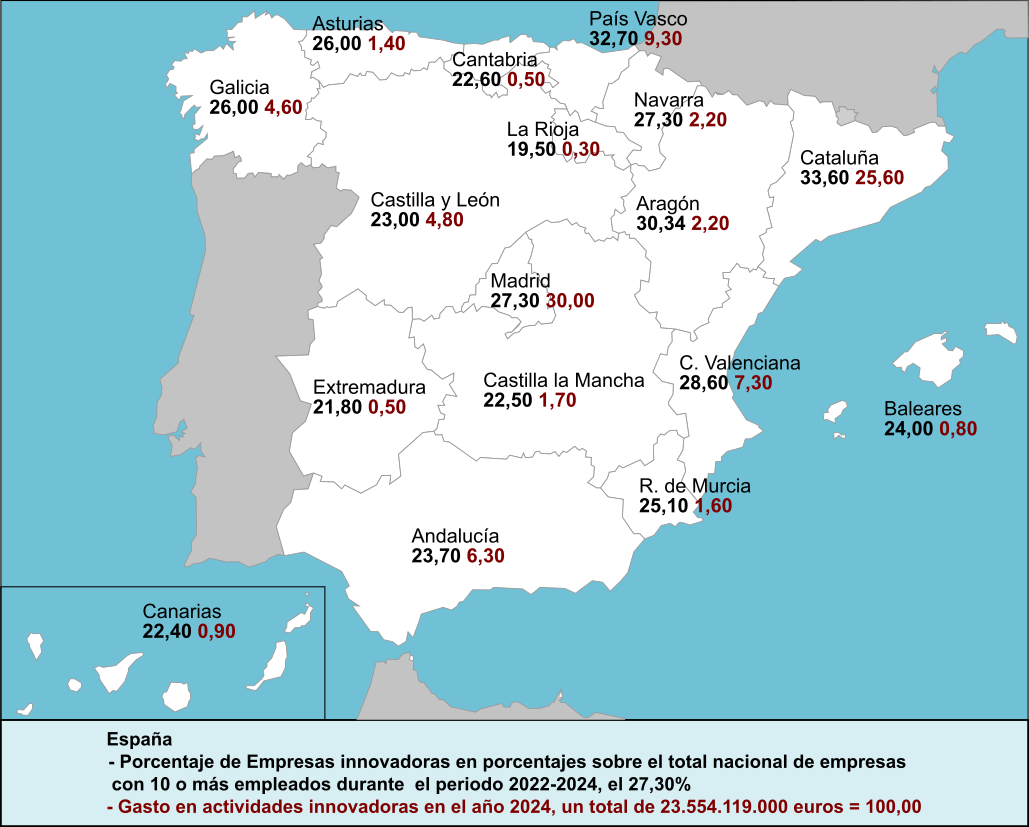 El mapa recoge en negrita los porcentajes de empresas Innovadoras por Comunidades autónomas en relación al total de sus empresas con diez o mas trabajadores en el periodo 2022-2024 y en rojo el porcentaje sobre el gasto total nacional en actividades innovadoras en el año 2024, según el INE, publicación del 18 de diciembre de 2025 “Encuesta de Innovación en las Empresas”.