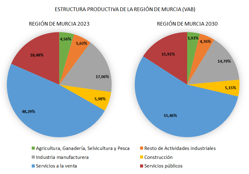 Gráficos con la estructura productiva de la Región de Murcia en colores en su aportación al VAB regional en el año 2023 y la simulación con los datos que se plantean en los servicios de mercado en 2030.
