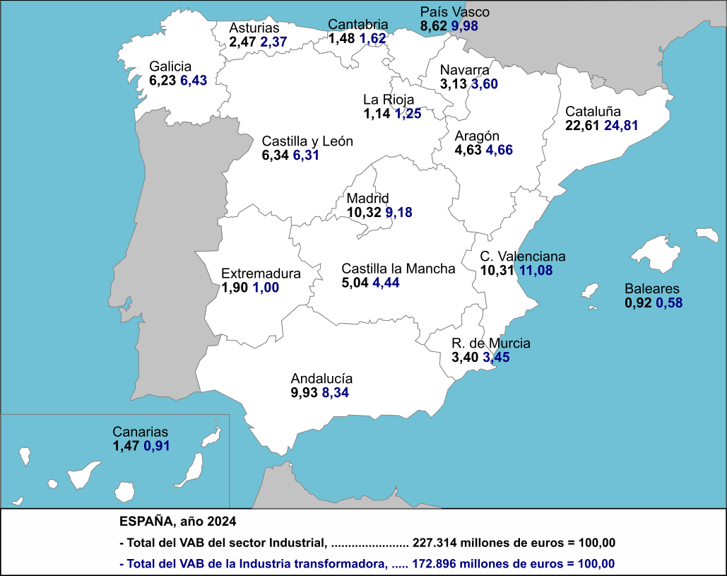 La Contabilidad Regional de España, publicada por el INE el 16 de diciembre de 2025, recoge los datos del año 2024, en el que el total del Valor Añadido Bruto de la Industria (VAB) ascendía a 227.314 millones de euros, correspondiente el 76,06 % a la Industria manufacturera con un total de 172.896 millones de euros, el mapa recoge en porcentajes la aportación de las Comunidades autónomas al total nacional.